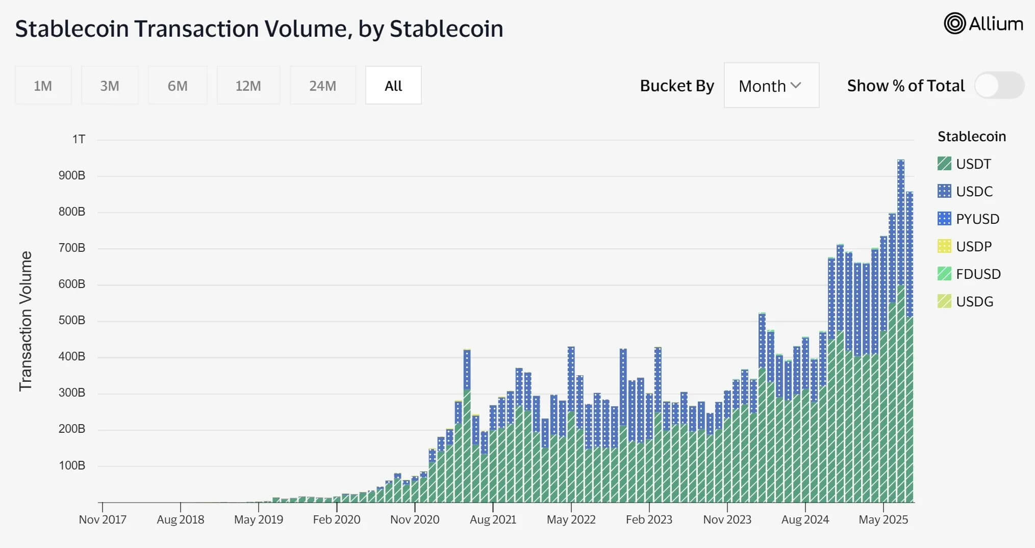 Stablecoin volumes are roughly on-par with the payment volumes in the Visa Network (1.1t$/mo), however, stablecoin volumes are growing rapidly.