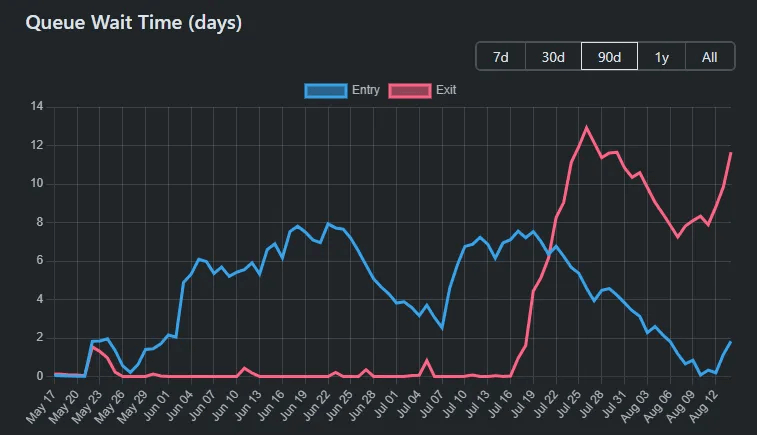 In crypto, duration risk rears its head largely as a result of major market shifts which drive rate changes and large redemption volumes that combined can cause significant losses. A good example is the wstETH:ETH looping trade unwind. In July 2025, positive price movements drove up the borrow rates across lending markets. Loopers were rate arbitraging the delta between the stETH yield and the ETH borrow rate on Aave by depositing wstETH as collateral to borrow ETH which is used to buy more wstETH which again is deposited as collateral in a loop. Because wstETH loopers receive a relatively stable rate of yield, but are exposed to variability on the borrow rate, effectively loopers are short duration. When borrow rates spiked, there was a looping unwind that caused the validator exit queue to grow to 12 days which caused a depeg of stETH.
