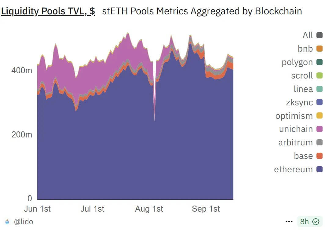 The by far largest LST is Lido stETH, with 86% market share. It has a TVL of $39b, however, it has only $450m in AMM liquidity.
