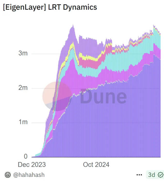 Restaking emerged as a major theme in late 2023 with the launch of Eigenlayer. Eigenlayer has retained about 8m of ETH in its system, remaining sticky over the last year, despite relatively low organic yield. Liquid Restaking Tokens have become a major collateral category in DeFi, with absolute dominance by EtherFi (dark purple) at 85% market share in the LRT category.