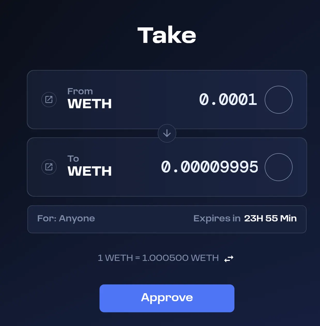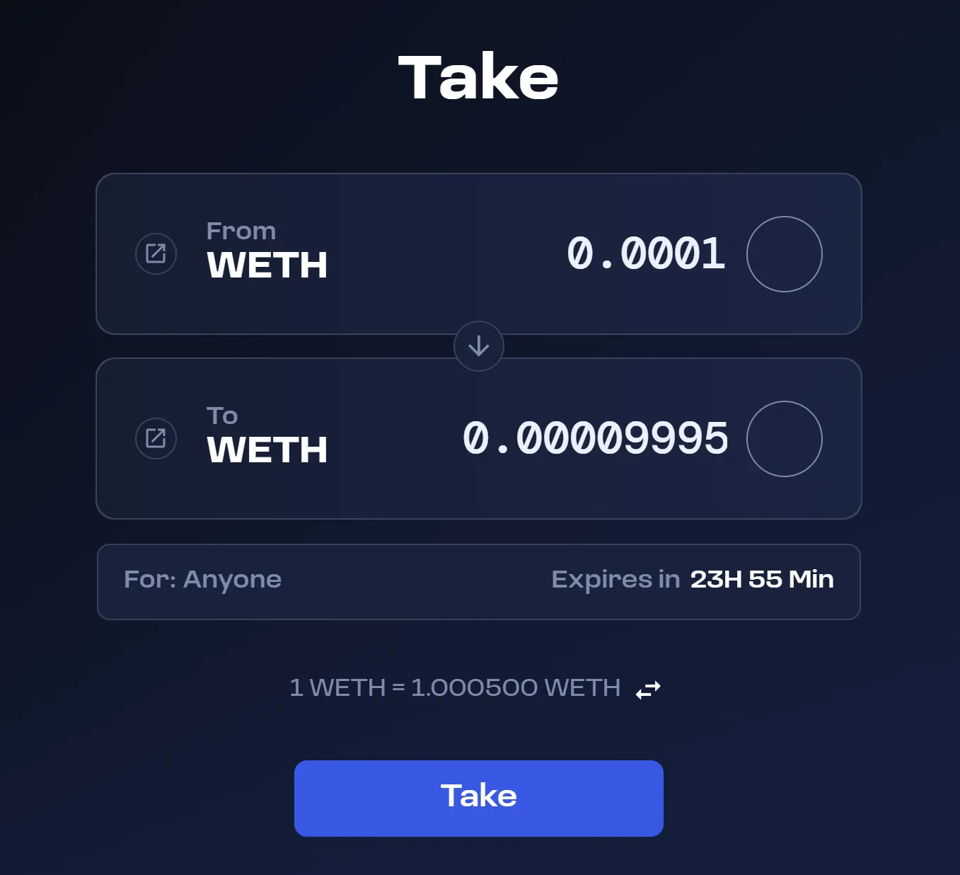 Following the approval of the payment token, you are ready to execute the trade by pressing Take which will trigger another transaction in your wallet.