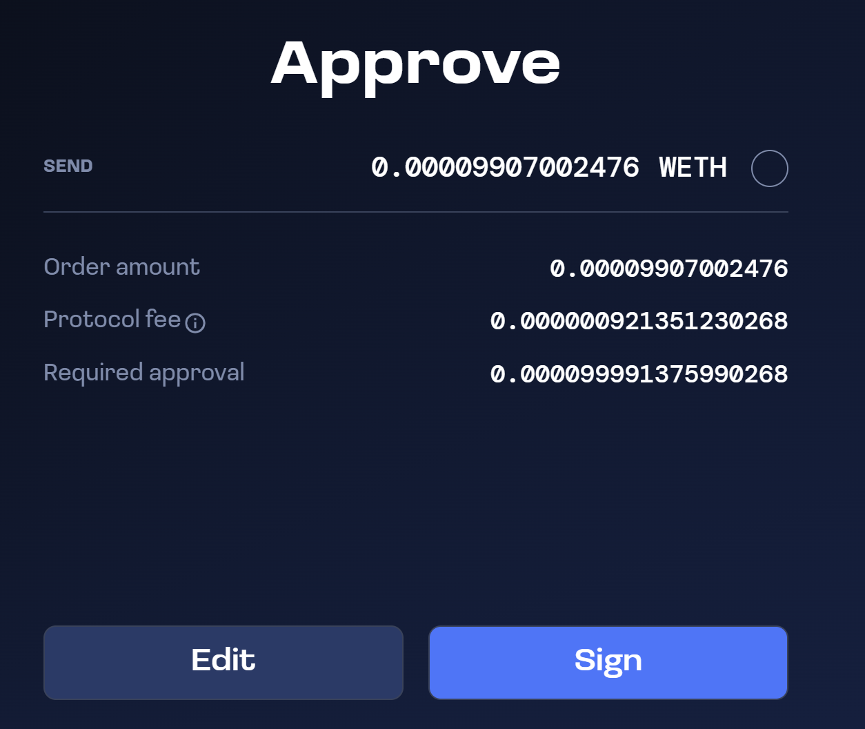 Press Sign to initiate token approval. The tokens will remain in your wallet but will be approved for spending and will be transferred from your wallet when the order is taken.